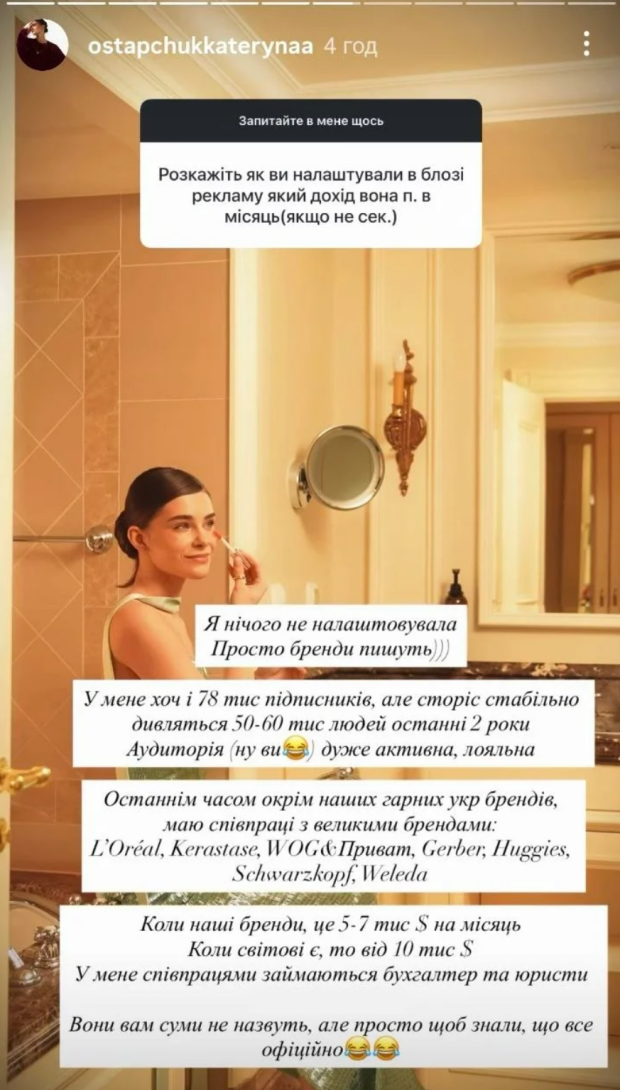 Співпраця з міжнародними компаніями приносить значно більше. У такому разі, за словами блогерки, її гонорари починаються від 10 тисяч доларів — тобто близько 430 тисяч гривень.
