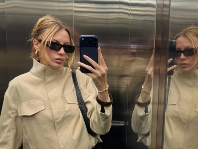 Леся была одета в ветровку песочного цвета и облегающие черные брюки, дополненные макияжем в нюдовых тонах и солнцезащитными очками, создавая повседневный, но стильный образ. Ее сын был тепло одет в темно-синюю куртку и джинсы, а сверху на нем была игривая вязаная шапочка в форме лесной ягоды.