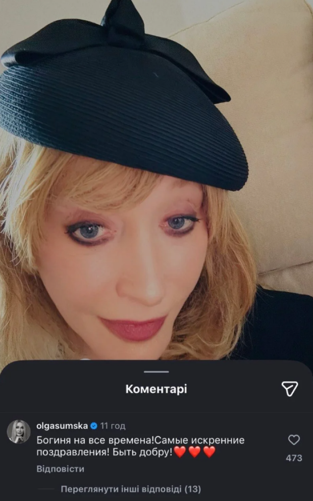 Ольга Сумская оставила комментарий под постом Максима Галкина, где перешла на русский язык и назвала Аллу Пугачеву вечной иконой, пожелав ей всего наилучшего.